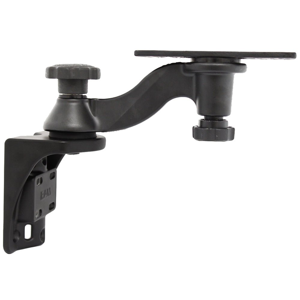 Single 6″ Swing Arm with 6.25″ x 2″ Rectangle Base and Vertical Mounting BaseThe RAM single swing arm mount consists of a 6″ long swing arm mounted on a vertical surface mounting base. At the device mounting end of the mount is a rectangular 6.25″ x 2″ plate. There are two (2) pivoting points on the mount. One at the swing arm and base and one at the center of the rectangular plate and the end of the swing arm. Each pivoting point allows a complete 360° rotation.Max Weight Capacity: